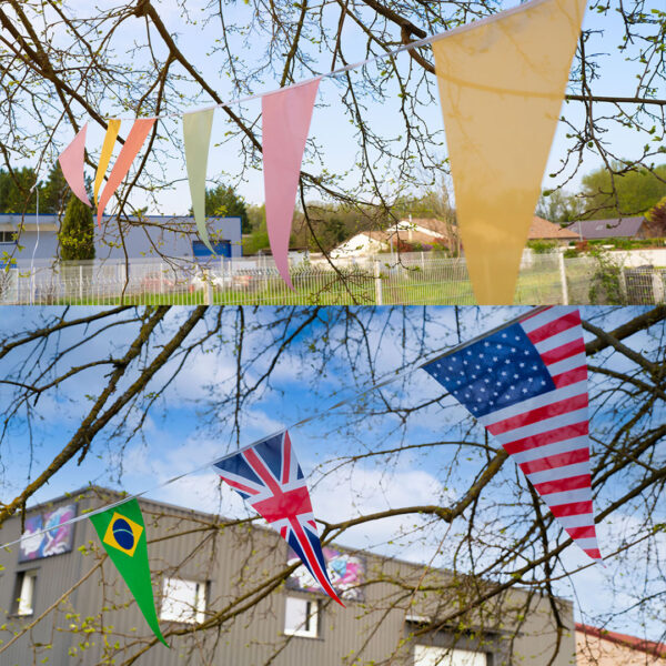 Alliez écologie, résistance et élégance avec nos guirlandes en tissu maille drapeaux, conçues pour durer et sublimer vos événements en toute légèreté.